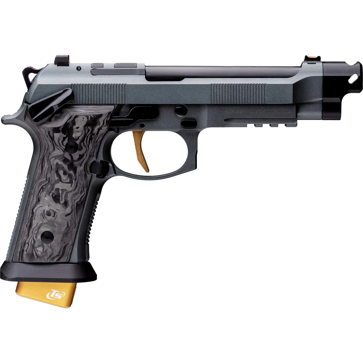 "INTRODUCING THE 92XI SAO CORSA, the pinnacle of race competition pistols, exuding the same exhilarating energy as a high-end race car tearing down the track. Crafted with precision and finesse, this masterpiece features luxurious gold-colored accents that elevate its aesthetic to unparalleled levels of elegance and performance. With its X-treme S Trigger, boasting DLC coated components and a lightweight skeletonized hammer, every shot is executed with unparalleled smoothness and precision. Equipped with three magazines featuring extended base pads for a total of 22 rounds, the Corsa ensures you're always ready to dominate the competition. Its frame-mounted safety, optics mounting for MRDS sights, and aggressive checkered frame provide unparalleled control and accuracy. The LOK Grips marbled carbon fiber grip panels have a striking yellow outline that add a touch of sophistication. With features like the Toni System Magwell and Single Port Toni System Compensator, the Corsa is engineered for ultimate performance on the race circuit. Experience the thrill of victory with the 92XI SAO Corsa—where precision meets prestige."