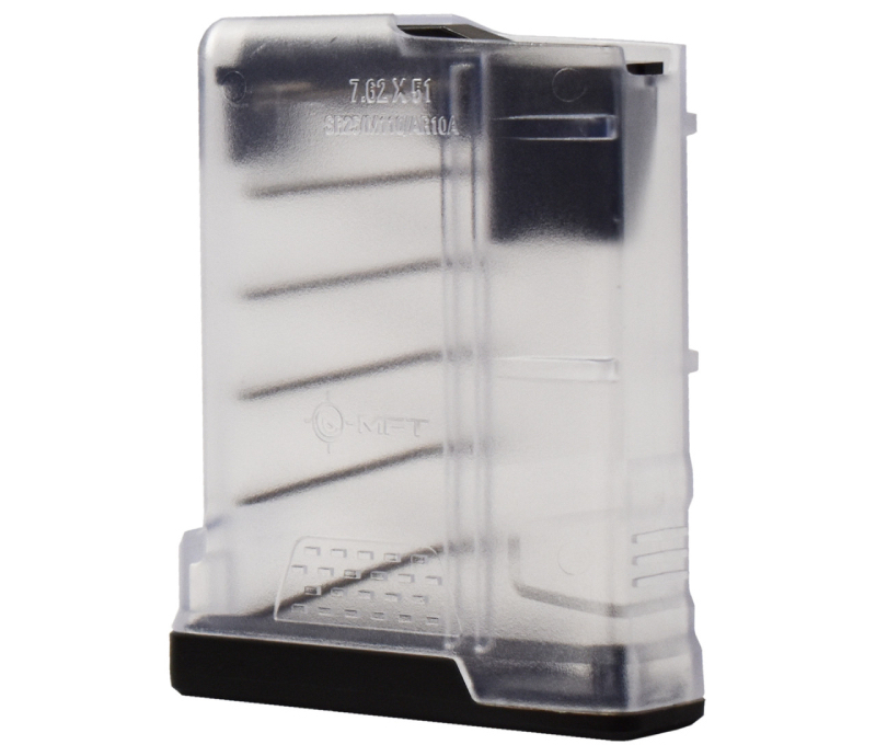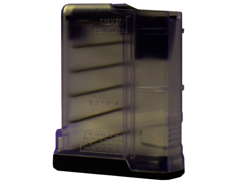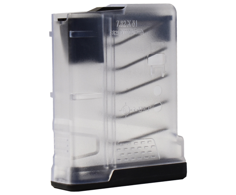 The MFT translucent magazine has been precision-engineered to deliver seamless compatibility with AR10A/SR25/M110 pattern rifles, ensuring optimal performance across these widely-adopted precision rifle systems. The magazine's design adheres to SAAMI specification requirements, guaranteeing consistent chambering and extraction with standard 7.62x51/.308 Winchester ammunition.