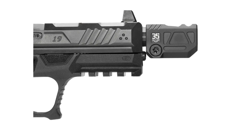 The 'V' stands for vertical as it's designed to kill all vertical movement of the muzzle when firing your handgun. This new and longer compensator's main difference from its original design (the Quad Comp) is that it will work right out of the box with your pistol without any tuning required.