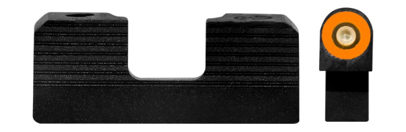 The front sight incorporates a dual-illumination system featuring both tritium technology and photoluminescent elements. Users can select between green and orange glow dot options to suit their personal preferences and shooting conditions. This combination ensures reliable visibility across various lighting scenarios, from bright daylight to complete darkness.